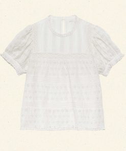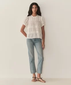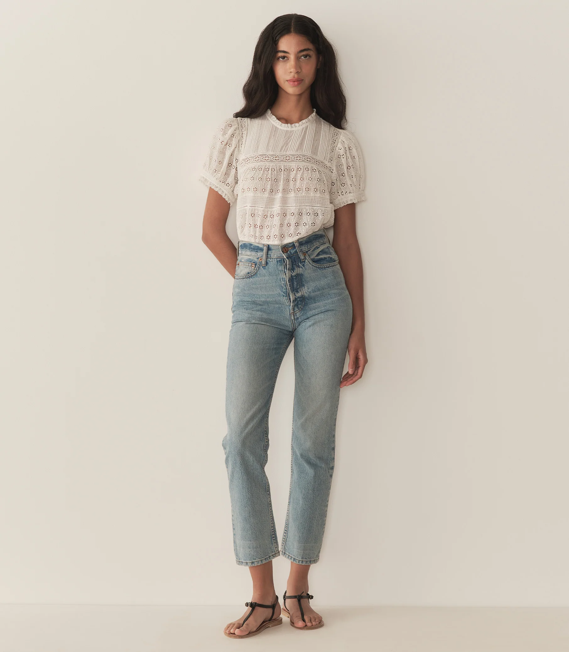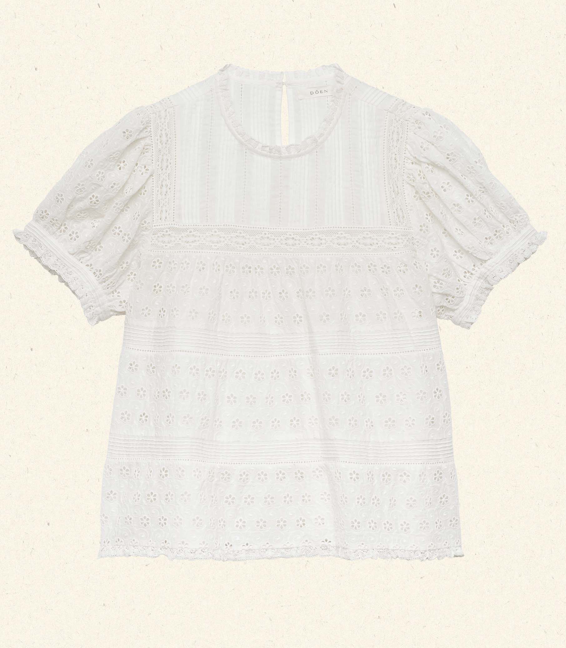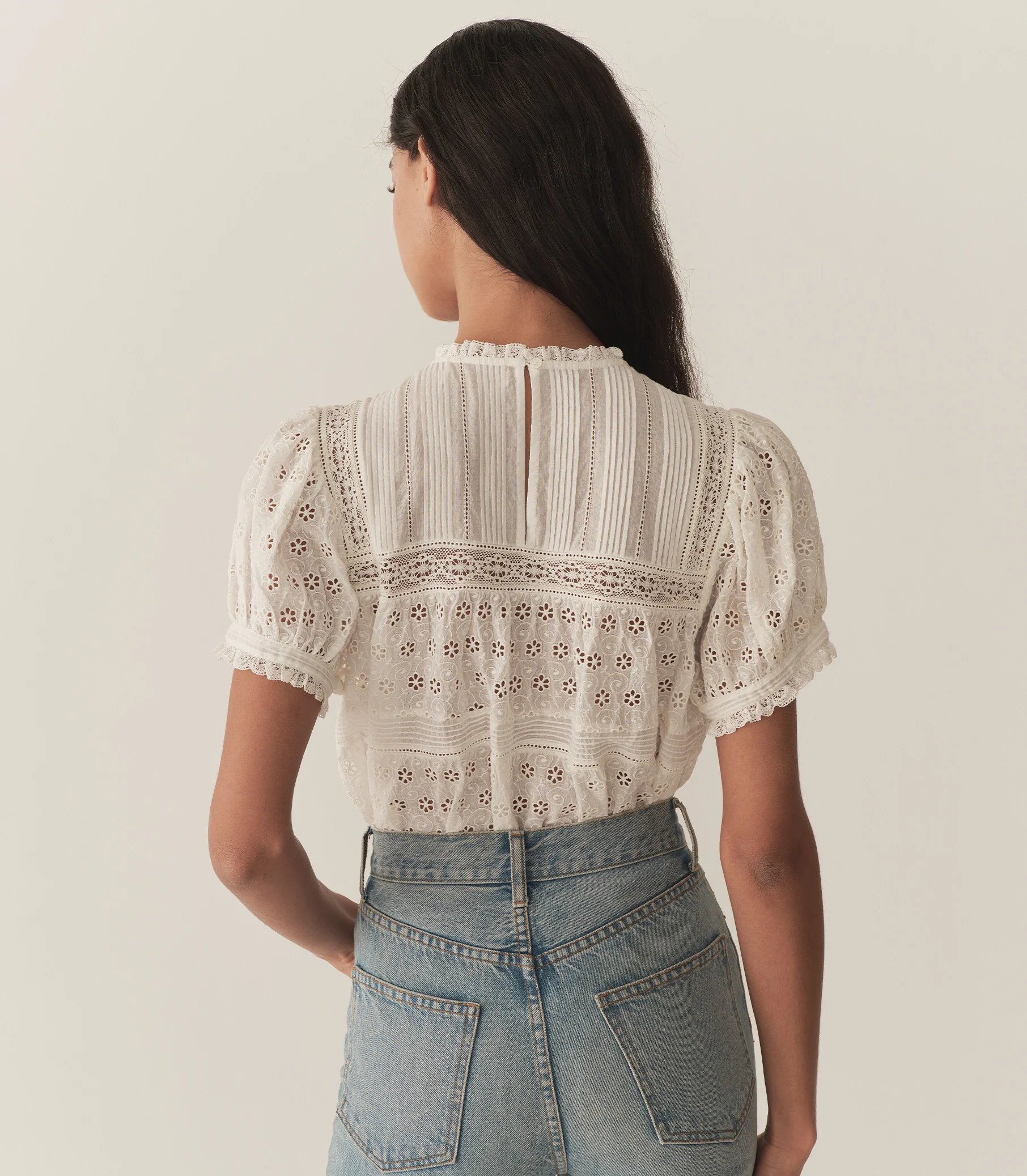 In lightweight organic cotton voile, the Adeline draws inspiration from our Adnet Top, which made its debut in Spring 2021. The breezy silhouette is adorned with allover eyelet embroidery and delicate pintucks at the yoke, while scallop edge lace trims the neckline, short puffed sleeve cuffs, and hem. A single petite button fastens at the back neck.