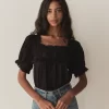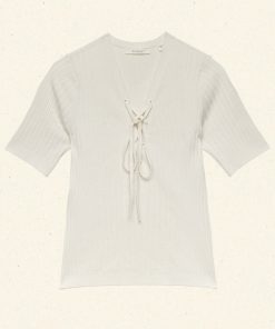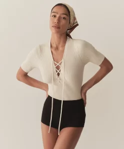 In a stretchy, lightweight linen blend with allover ribbing, the Auguste Top features a fitted silhouette and elbow-length sleeves detailed with delicate pointelle. The plunging V-neckline laced with a tie allows you to cinch as much as you’d like.