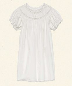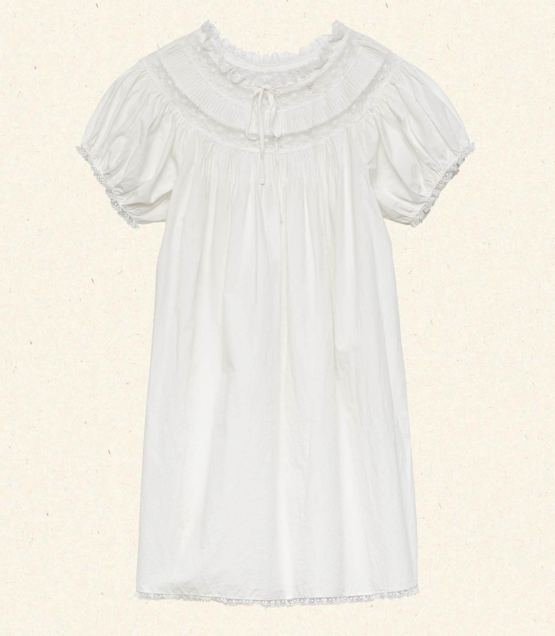 In crisp organic cotton poplin, the Daphné Dress features a breezy A-line silhouette with short puffed sleeves and a mini-length hemline. Floral scallop lace, pintucks and a grosgrain ribbon tie adorn the yoke and neckline, while scallop edge lace trims the sleeve cuffs and hem.