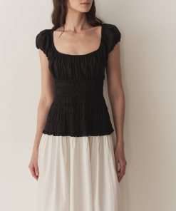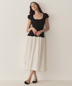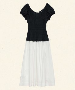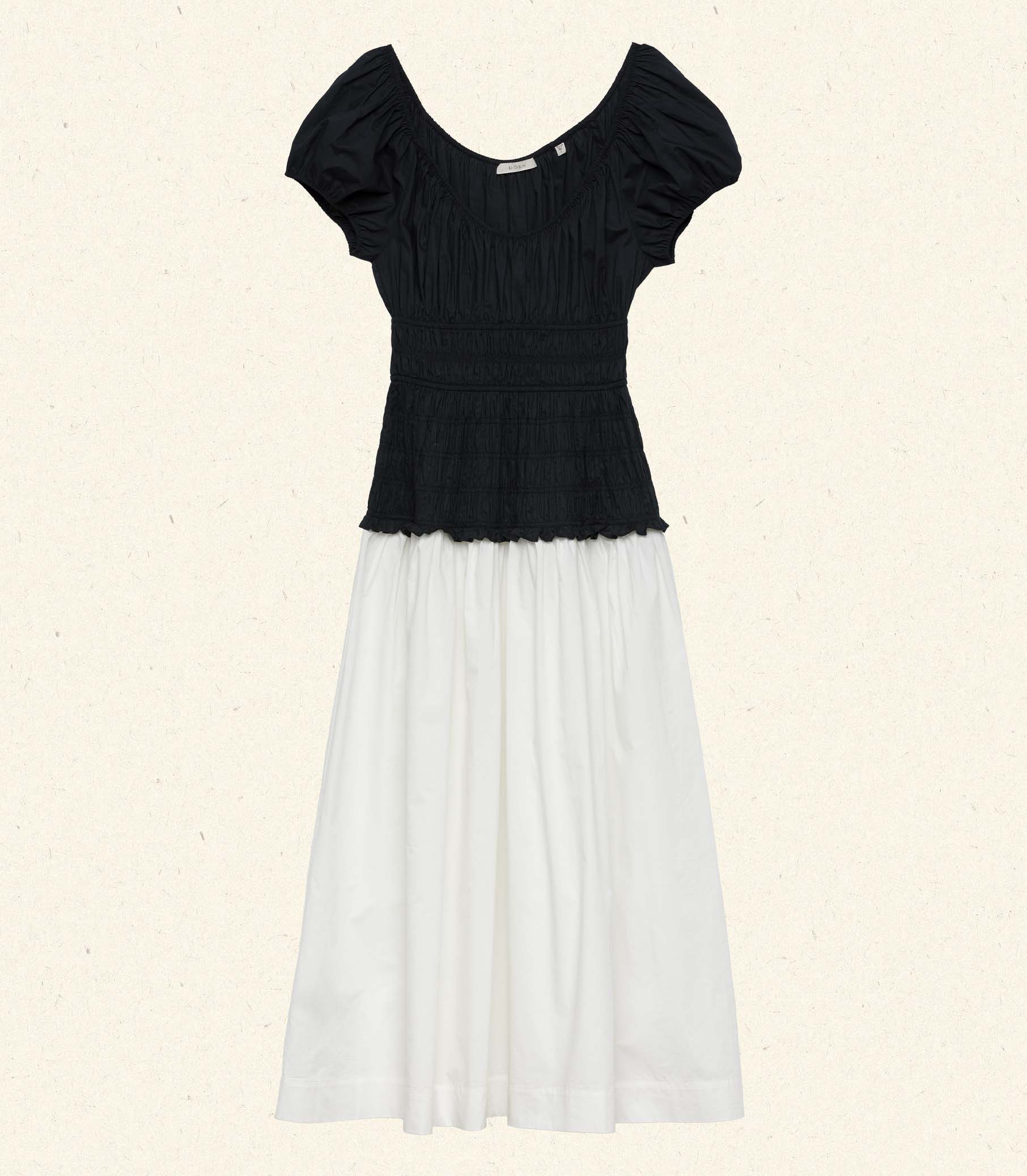 In a crisp organic cotton poplin, the Enya Dress features a scoop neckline, a gathered bust, short puffed sleeves, and a smocked bodice. A third gathered panel finishes just below the hips, flaring out into an ankle-length skirt, while elastic lends give to the short puffed sleeves, bust, and waist.