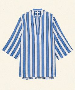 In crisp, lightweight linen adorned with our Atrani Stripe—a print reminiscent of 1930s beach cabanas—the Gisele Dress features a high neck with a Nehru collar, three-quarter-length sleeves, and an A-line silhouette. The high-low mini hemline is finished with an embroidered “D” at the bottom left.