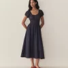 In crisp, lightweight linen adorned with our Atrani Stripe—a print reminiscent of 1930s beach cabanas—the Gisele Dress features a high neck with a Nehru collar, three-quarter-length sleeves, and an A-line silhouette. The high-low mini hemline is finished with an embroidered “D” at the bottom left.
