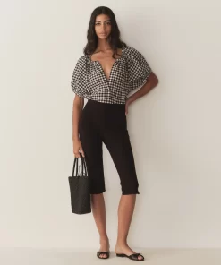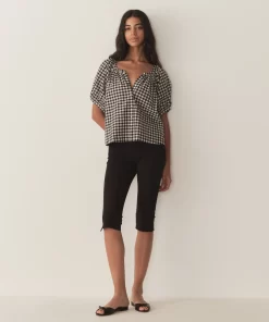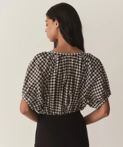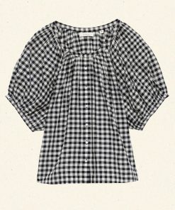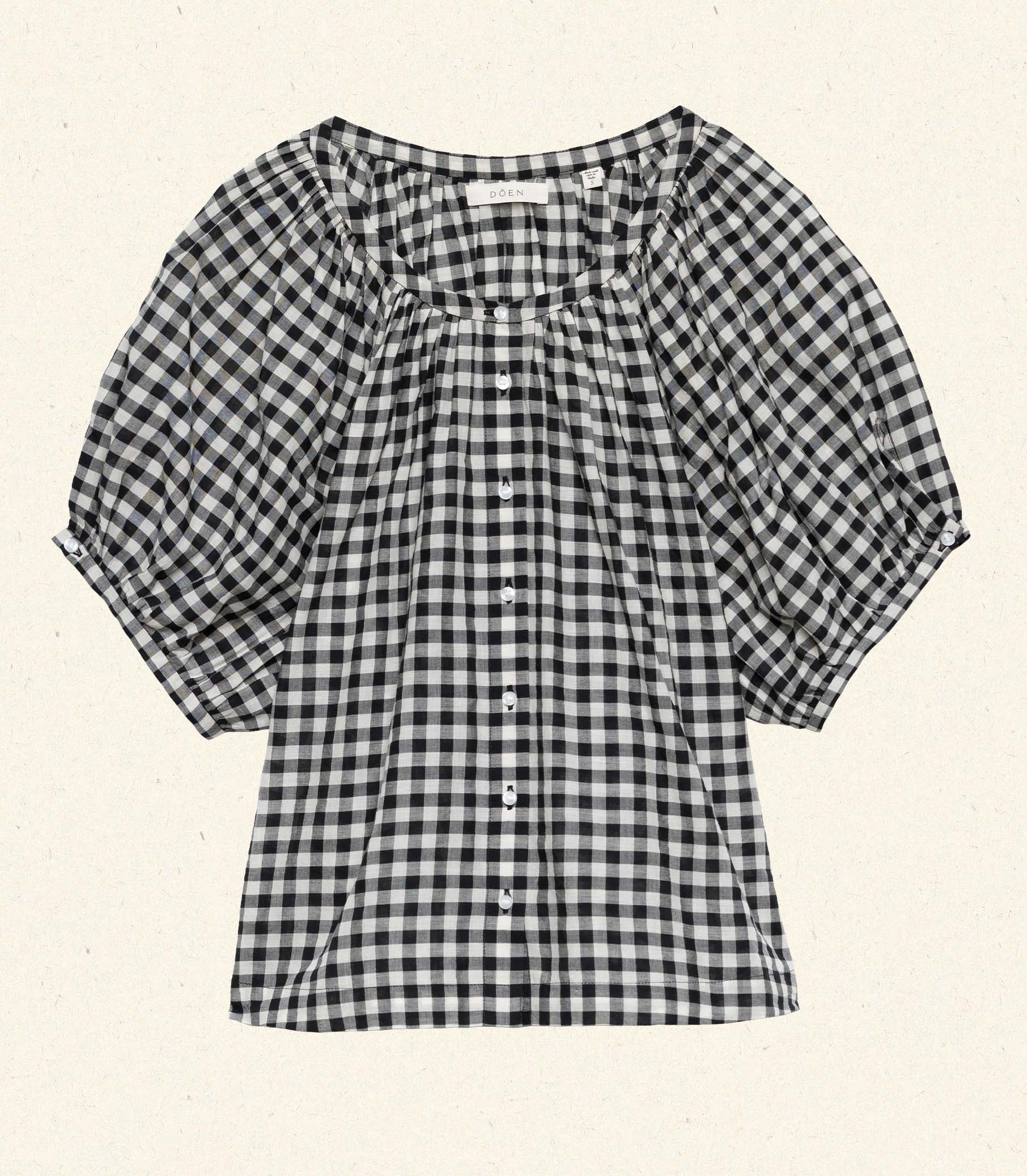 Crafted from a soft, lightweight organic cotton voile, the June Top is a short-sleeved take on our beloved Jane Blouse. Now refreshed in a ‘50s-inspired Noir Greta Gingham, the June features a gathered scoop neckline, full raglan sleeves, and a relaxed, breezy cut. A line of mother-of-pearl buttons extends down the center front. Wear it loose, or tuck it into your favorite high-waisted jeans or shorts.