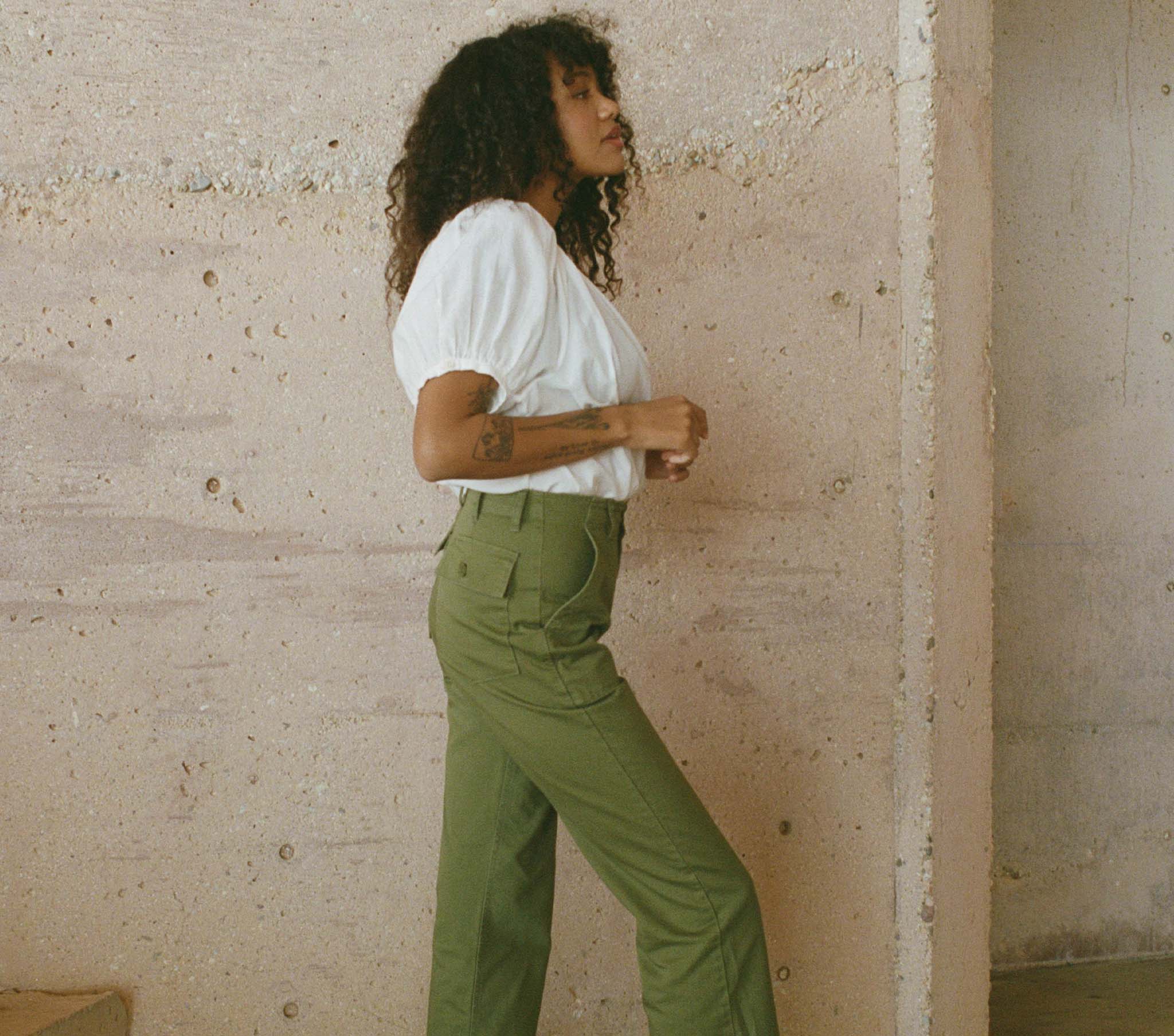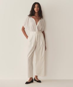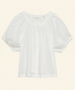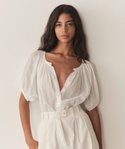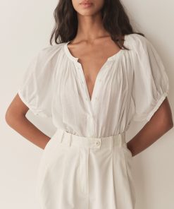 Crafted from a lightweight blend of organic cotton and viscose, the June Top is a short-sleeved take on our beloved Jane Blouse. It features a gathered scoop neckline, full raglan sleeves, and a relaxed, breezy cut. A line of mother-of-pearl buttons extends down the center front. Wear it loose, or tuck it into your favorite high-waisted jeans or shorts.