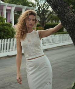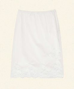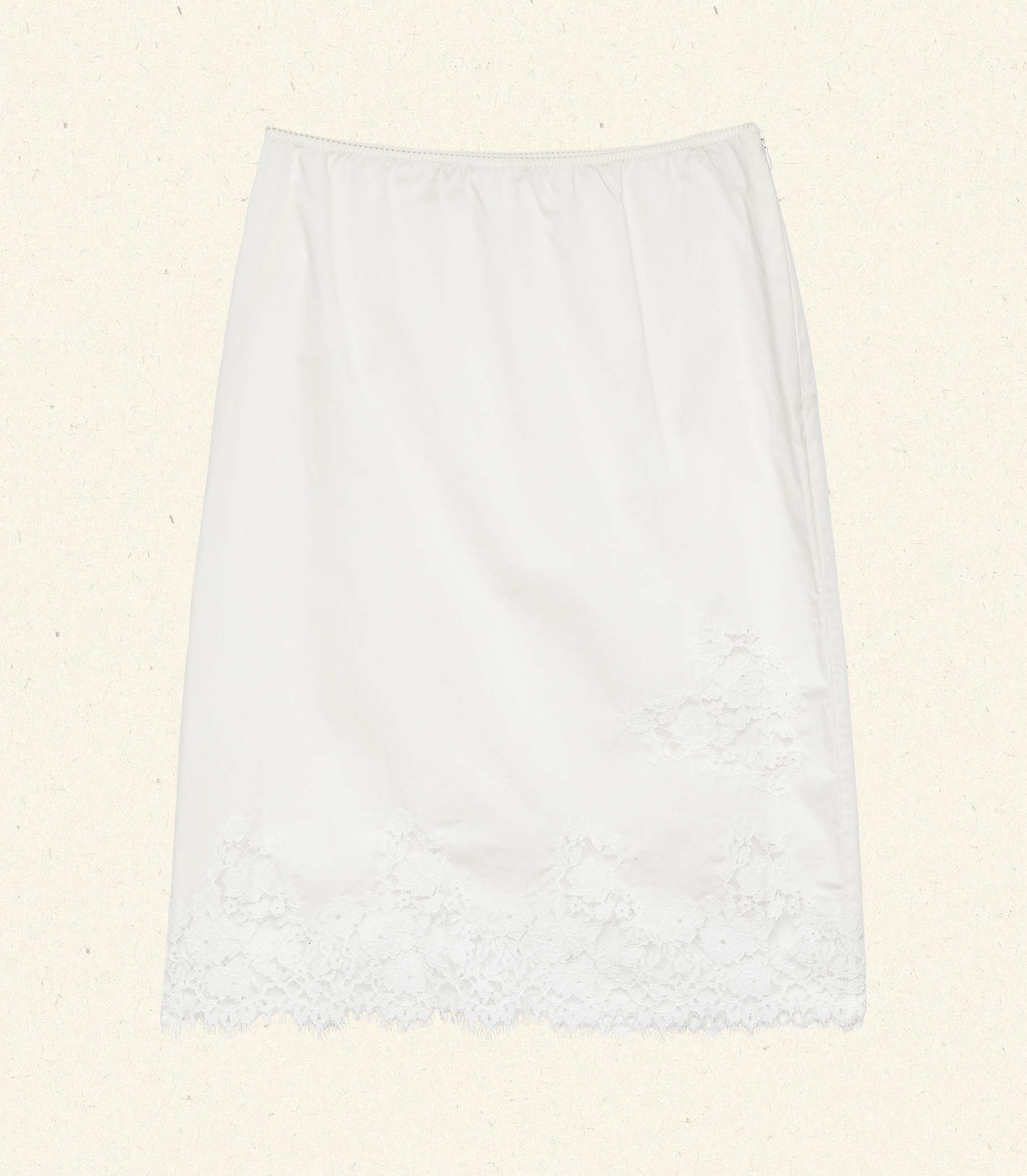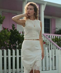 In crisp organic cotton poplin, the Melanie Skirt features a high waist trimmed with elastic scallop detailing, a softly structured pencil silhouette, and floral lace insets along the hip and hem. An invisible side zipper offers the perfect fit.