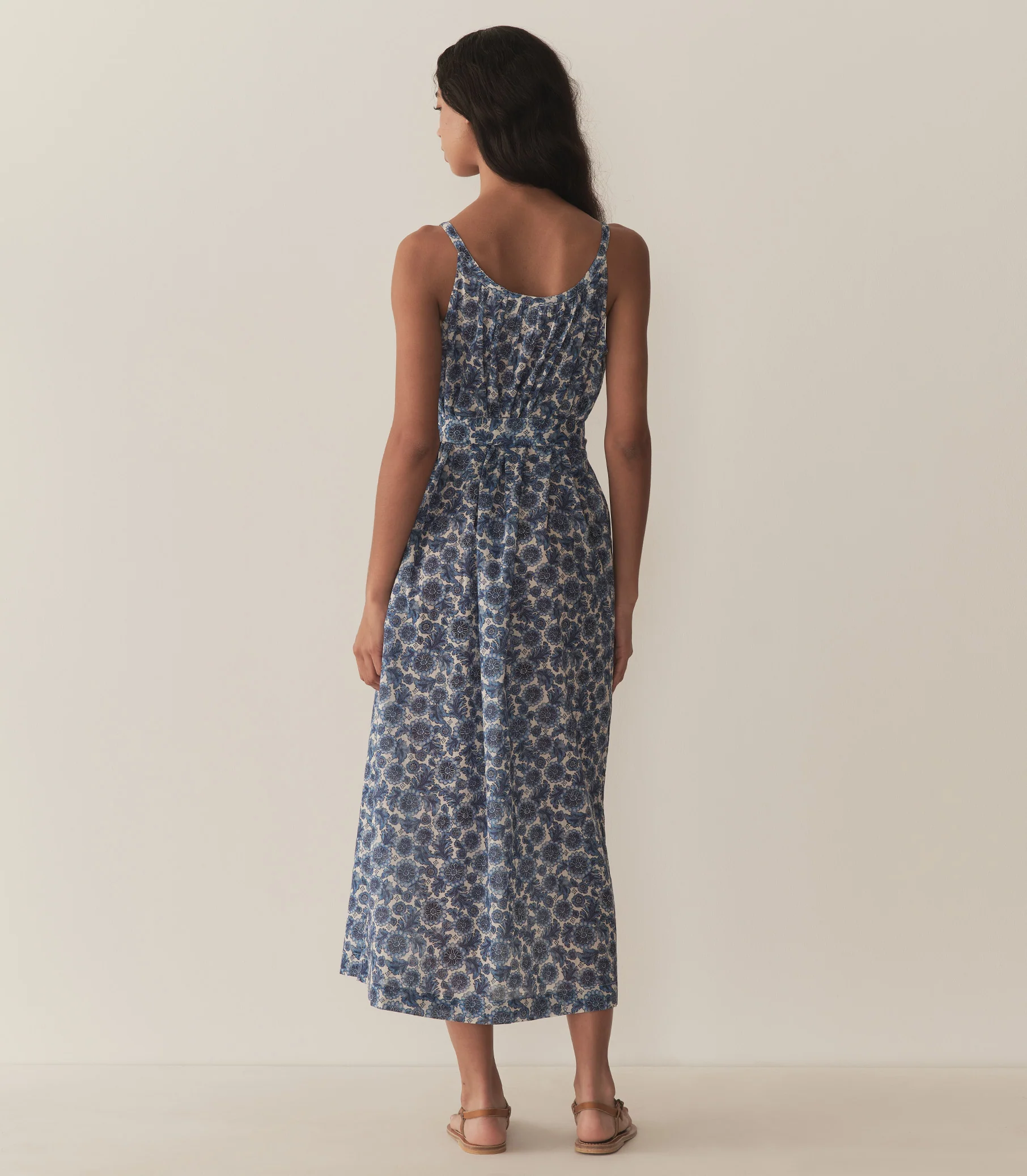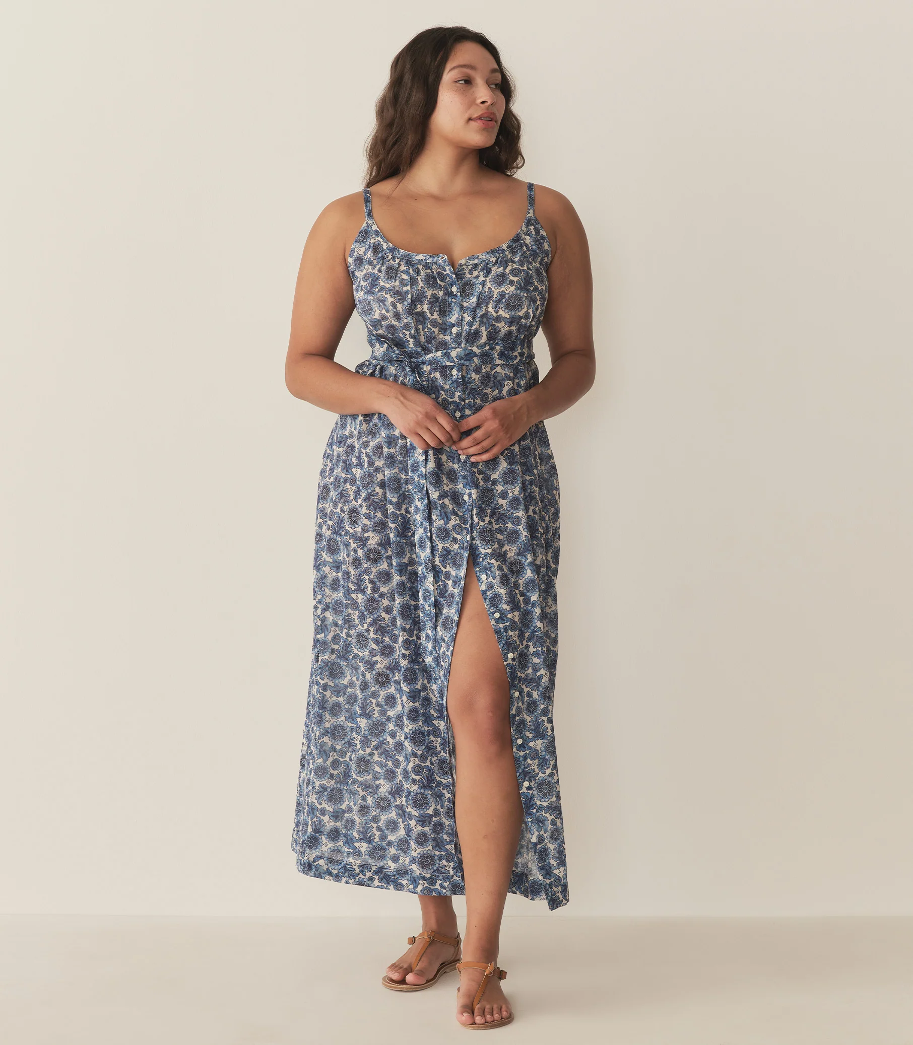 Light and breezy, the Nevita Dress is rendered in soft, organic cotton voile adorned with our Soleil Fleurit print—a motif inspired by an antique French block-printed quilt sourced by our co-founder Katherine. It features a gathered scoop neckline, slender straps, and a breezy silhouette with an adjustable waist tie. Mother-of-pearl buttons extend down the front.