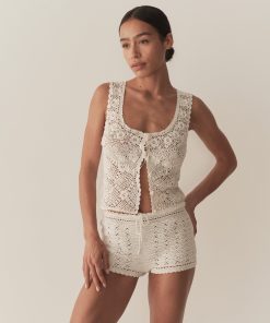 Hand-crocheted in Peru, the DÔEN Heirloom Noelle Short draws inspiration from the mini shorts of the late 1960s folk music scene. Featuring an allover crochet pointelle design, the Noelle is finished with an adjustable drawstring at the waist for an easy fit. nnCrafted from 100% mercerized Pima cotton, each short is skillfully hand-crocheted by our artisans in Peru, with each one taking several days to complete. Because each short is handmade, no two are exactly alike.