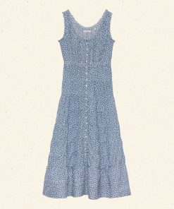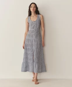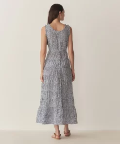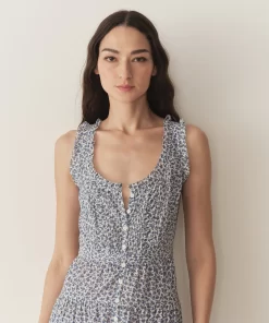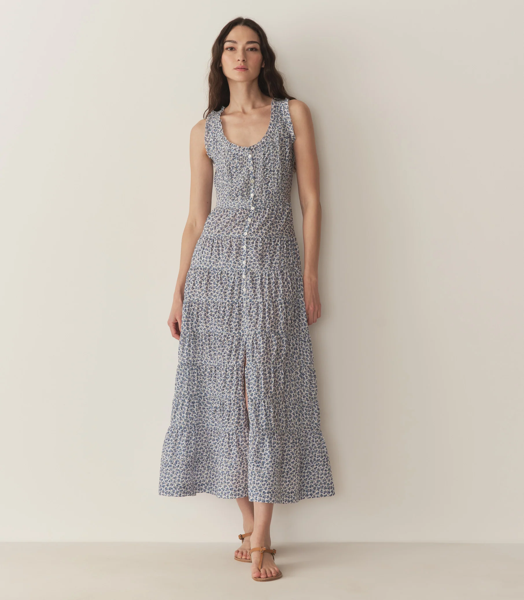 Crafted in a soft, lightweight organic cotton voile and adorned with our Cornflower Hillside Bloom, the Ottessa Dress features a scoop neckline and straps trimmed with petite ruffles. Alternating panels of pintucks and shirring lend texture to the fitted bodice, which gives way to an ankle-grazing A-line tiered skirt. Mother-of-pearl buttons extend down the center front.