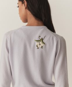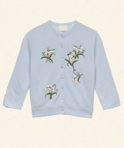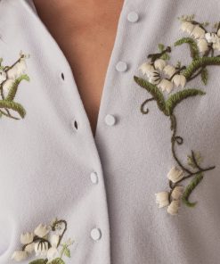 Inspired by knits from the ‘50s, the DÔEN Heirloom Teresa Cardigan—made from the softest blend of wool and cashmere with a satin lining—features skillfully hand-embroidered lily of the valley flowers, satin piping at the sleeve opening, and satin covered dome buttons.