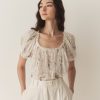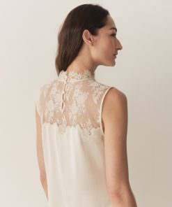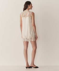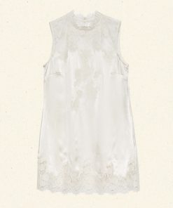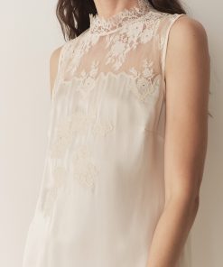 In a buttery silk satin, the Valeria Dress is a ‘90s-inspired sleeveless shift dress. It features a straight cut, a high neck, and a playful mini-length hemline. Intricate floral lace adorns the neckline, bodice and hem. Four self-covered buttons fasten at the back of the neck.